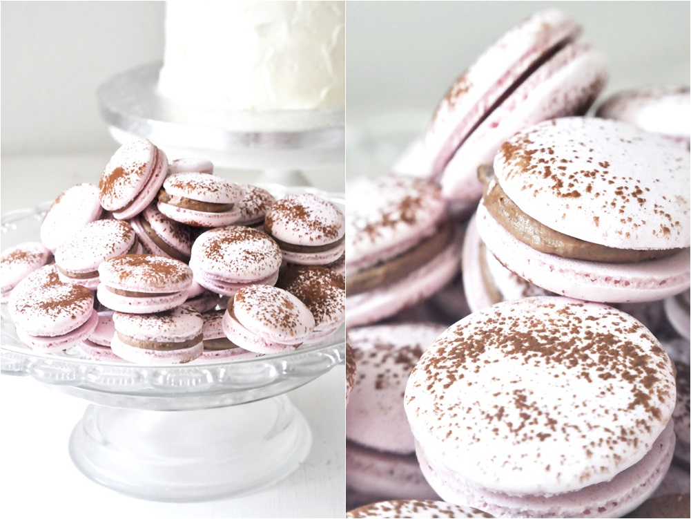 Rosa Macarons med nutellafrosting pudrade med kakao