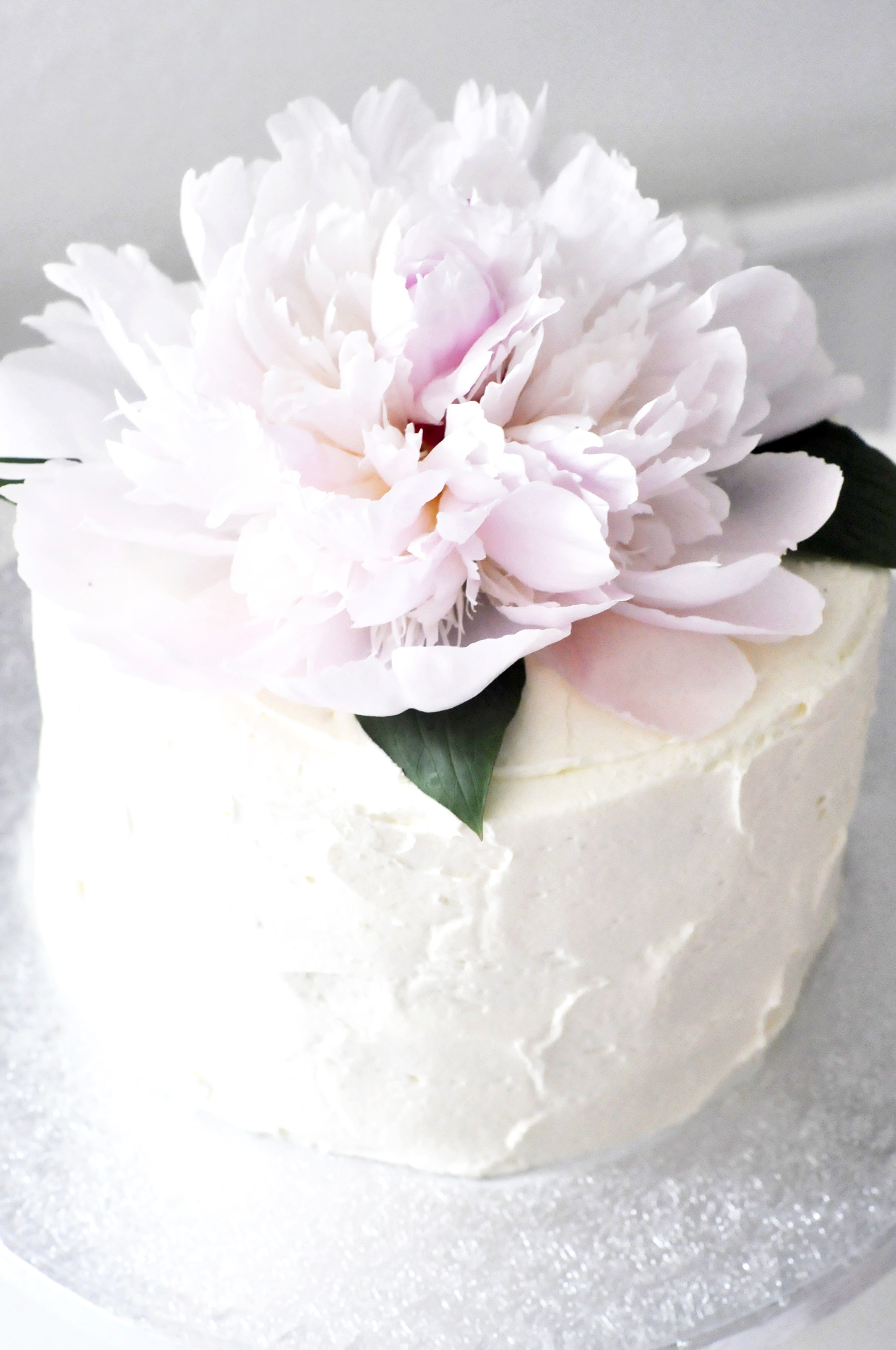 Cake with vanilla cake & vanilla butter cream decorated with a fresh peony