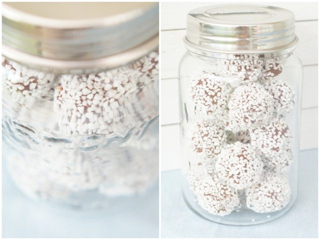 På bordet finns Cake pops med smak av kola & vanilj, Damsugare på pinne, Mazariner fyllda med skogsbär, Maränger & En liten tårta med lemoncurd & maräng.